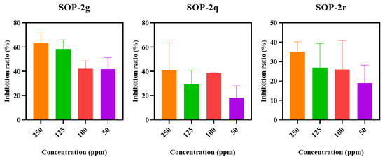 The inhibition rates of the sophoridine derivatives (SOP-2g, SOP-2q, and SOP-2r) on AChE at different concentrations were tested, and results are shown in Figure 5. The inhibition rate of SOP-2g with 63.16% was higher than those of SOP-2q and SOP-2r, with 46.67% and 35.11%, respectively, at the highest concentration (250 ppm) of each compound. At the lowest concentration (50 ppm), SOP-2g remained the most potent analog with an inhibition rate of 44.72%. Intriguingly, the inhibitory activities against the larval AChE of these three sophoridine derivatives were generally concentration-dependent. Thus, the insecticidal mechanism of the SOP derivatives could be partially mediated by inhibiting AChE. Insect poisoning or even death can result from the cholinergic system being destroyed or obstructed, which overstimulates larval neurons and causes them to produce excess levels of the neurotransmitter acetylcholine. Further studies are required to validate this hypothesis.