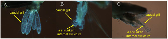 Observation of the larval caudal gill: (A) the negative control group; (B) the SOP-2q treated group; (C) the SOP-2r treated group.
