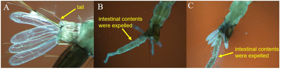 The tail of the larvae in the control group had a normal shape (Figure 8A), whereas the experimental treatment groups had intestinal content discharge at the tail (Figure 8B,C). According to the literature [47], the intestinal contents were expelled because the intestinal epithelial cells ruptured, thereby permitting the whole extrusion of the intestinal contents along with the nutritional matrix surrounding the intestine. Researchers have demonstrated that larvae underwent partial or complete elimination of nutritional substrates as a defensive strategy to remove hazardous chemicals [48,49]. The compound with a toxic effect on the larvae destroyed the intestinal epithelial cells, so the intestinal lumen completely collapsed. Moreover, the larvae started their own defense system that extruded the nutrient matrix out of the body, causing larval death.