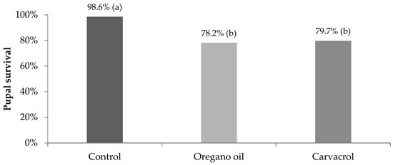 Pupal survival (%) of Cx. pipiens biotype molestus mosquitoes that remained alive after 24 h exposure of 3rd–4th instar larvae to LC50 concentrations of oregano oil (n = 55) and carvacrol (n = 69), and to water solution of 2% DMSO (control) (n = 71). Percentages in a column followed by a different letter are significantly different (p < 0.05).