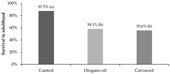 After the application of the calculated LC50 concentrations of oregano oil (19.9 μL L−1) and carvacrol (6.4 μL L−1) on 3rd–4th instar larvae of Cx. Pipiens biotype molestus, 46.3% (74/160) and 61.9% (99/160) of the treated larvae survived after 24 h, respectively, while no mortality was observed in the control. The 24 h exposure of mosquito larvae to LC50 concentrations of both tested materials significantly reduced the percentage of surviving larvae that managed to pupate when compared to the control (Figure 1). Furthermore, the rate of surviving pupae that successfully turned into adults was significantly lower after oregano oil and carvacrol treatment in comparison to the control (Figure 2). Overall, only 58.1% and 55.6% of the larvae that survived after 24 h exposure to LC50 concentrations of oregano oil and carvacrol, respectively, finally reached adulthood, differing significantly from the survival rate to adulthood in the control (87.5%) (Figure 3). These findings indicate that the acute toxic larvicidal LC50 concentrations caused significant delayed mortality in surviving mosquitoes at the larval and pupal stages.
