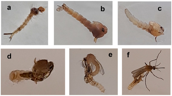 Interesting morphological abnormalities were observed in some cases after exposing larvae to LC50 concentrations of oregano oil or carvacrol: elongated dead larvae, larviform dead pupae being partially melanized or demelanized, and adults that failed to emerge properly and died on the water surface. Occasionally, only the head and thorax emerged from the puparium, or the adults were still attached to the puparium by one or more legs (Figure 4).
