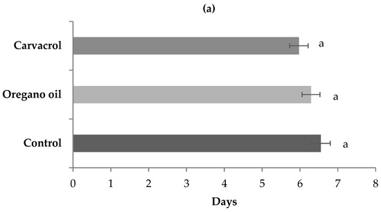 As shown in Figure 5, the treatment of 3rd–4th instar larvae with LC50 concentrations of both oregano oil and carvacrol for 24 h did not significantly affect the developmental time of the surviving larvae to pupation (p = 0.311) or, subsequently, the longevity of the surviving pupae until adulthood (p = 0.717), when compared to the untreated control.
