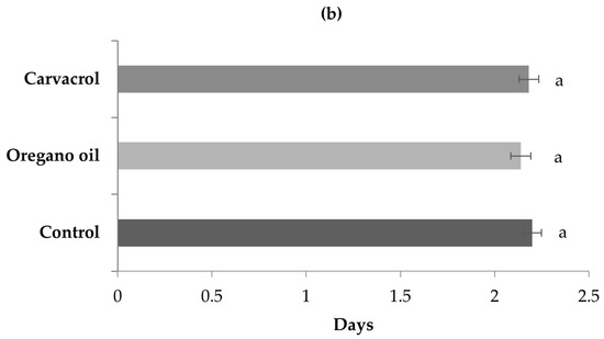 Mean (±S.E.M.) number of days for larval (a) and pupal (b) development of Cx. pipiens biotype molestus mosquitoes that remained alive after 24 h exposure of 3rd–4th instar larvae to LC50 concentrations of oregano oil and carvacrol, and to water solution of 2% DMSO (control). Means in a column followed by a different letter are significantly different (p < 0.05).
