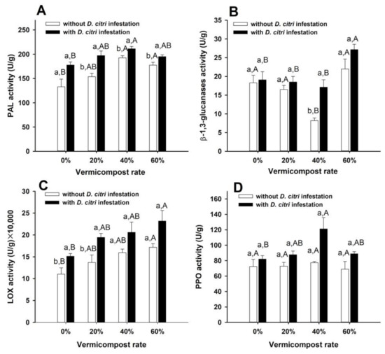 APA StyleTao, T., Wang, Z., Mao, R., Hussain, M., Arthurs, S. P., Ye, F., An, X., & Gao, J. (2023). Vermicompost Amendments Disrupt Feeding Behavior of Diaphorina citri Kuwayama and Boost Activities of Salicylic Acid and Jasmonic Acid Pathway-Related Enzymes in Citrus. Insects, 14(5), 410. https://doi.org/10.3390/insects14050410