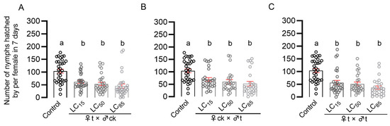 Effects of pymetrozine treatment at third-instar nymph stage on the fecundity of N. lugens. Single female fecundity after emergence of N. lugens nymphs treated with sub-lethal, median, and high concentrations of pymetrozine ((A) ♀t × ♂ck; (B) ♀ck × ♂t; and (C) ♀t × ♂t). The variance analysis of all data was performed by one-way ANOVA with post hoc Tukey HSD. Error bars represent SE. Different lowercase letters showed significant differences at the 0.05 level (p < 0.05).