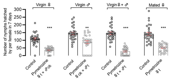 Effects of pymetrozine treatment at the adult stage on the fecundity of N. lugens using the topical application method. Statistical analysis of normal distribution data was performed using Student’s t-test and statistical analysis of abnormal distribution data was performed using Mann–Whitney test. Error bars represent SE (** p < 0.001; *** p < 0.0001).