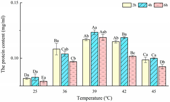 The statistical analyses were carried out by using the general linear model procedure of SPSS 26.0 software (SPSS, Inc., Chicago, IL, USA). The one-way ANOVA (followed by Duncan’s new multiple range method, p < 0.05) was applied to test the differences among the protein content and enzyme activities. The relations between temperature and treatment duration were analyzed with a two-way analysis of variance (ANOVA) and followed by Tukey HSD post hoc tests (p < 0.05). Origin 2018 (OriginLab, Northampton, MA, USA) was used to conduct the standard curve of bovine serum albumin calculation and figures.