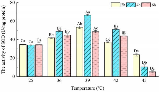As shown in Figure 2, the SOD activity of T. urticae was significantly affected by the temperatures (F = 784.38; p < 0.001) and durations (F = 39.24; p < 0.001), and the interactions among these treatment factors were significant (F = 51.05; p < 0.001). After exposure to the heat stress for different durations, the activity of SOD in T. urticae reached the maximum (66.48 U/mg protein) at 39 °C-4 h, which is more than twice the control at 28.52 U/mg protein. The minimum (5.26 U/mg protein) appeared at 45 °C-6 h, which is nearly one-seventh of the control with 34.46 U/mg protein. The SOD activity showed the same trend: it first increased from 25 °C to 39 °C, and decreased from 39 °C to 45 °C. SOD activity after 2-, 4-, and 6-h treatments at 45 °C was significantly lower than that at 25 °C (F2h = 141.80, p2h <0.001; F4h = 532.90, p4h < 0.001; F6h = 231.76, p6h < 0.001).