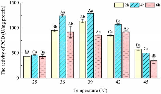The changes in the POD activity of T. urticae in response to heat stress are shown in Figure 3. In comparison with controls, the POD activity was significantly enhanced at all temperatures (F = 322.98; p < 0.001) and durations (F = 63.41; p < 0.001) tested by two-way ANOVA, and there was a significant interaction among these treatment factors (F = 12.63; p < 0.001). The POD activity in T. urticae, recorded with only 391.69 U/mg protein, was lowest at 45 °C-6 h. The maximum value of POD activity was recorded as 1289.02 U/mg protein at 39 °C-4 h. The POD activity increased significantly (F = 121.74; p < 0.001) at 36–45 °C when the exposure time was 2 h and increased significantly (F = 559.327; p < 0.001) at 36, 39, and 42 °C when the exposure times were 4 and 6 h. No difference was found after exposure to 45 °C for 4 and 6 h.