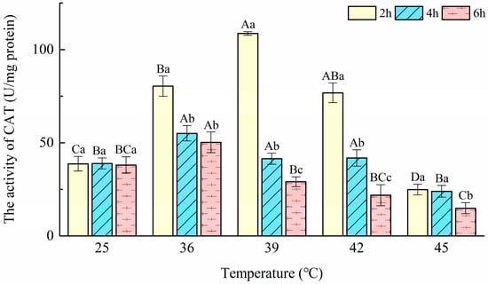 The CAT activity of T. urticae under different heat stresses is presented in Figure 4. The two-way ANOVA showed that CAT activities were significantly affected by treatment temperature (F = 95.20; p < 0.001), duration (F = 124.85; p < 0.001), and their interaction (F = 18.31; p < 0.001). For three durations, the treatments at 45 °C significantly inhibited the CAT activity compared with controls (F2h = 136.57, p2h < 0.001; F4h = 18.67, p4h < 0.001; F6h = 18.28, p6h < 0.001). In a 2 h exposure at 39 °C, the CAT activity reached the maximum (recorded as 108.63 U/mg protein), 2.4 times higher than the control, and its minimum (14.67 U/mg protein) was showed at 45 °C-6 h. The CAT activity went up in the 2 h and 4 h treatments of 36, 39, and 42 °C compared with controls. When the exposure duration was extended to 6 h, it showed no significant difference at 42 °C compared with the control and was significantly higher than the controls at 36 °C and 39 °C (F = 18.28; p < 0.001).