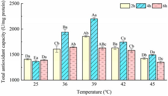 As shown in Figure 5, T-AOC was significantly affected by treatment temperatures (F = 320.76; p < 0.001) and durations (F = 158.59; p < 0.001), and there was a significant interaction between temperature and duration (F = 35.00; p < 0.001). When the mites were treated at 36 °C, 39 °C, and 42 °C for three durations, T-AOC significantly increased compared with the controls (F2h = 66.07, p2h < 0.001; F4h = 230.40, p4h < 0.001; F6h = 73.16, p6h < 0.001) tested by the one-way ANOVA. The maximum (2200.97 U/mg protein) was present at 39 °C-4 h, and the minimum (1351.05 U/mg protein) was shown at 45 °C-6 h. When the exposure durations were 2 and 4 h, T-AOC showed the same trend that first increased and peaked at 39 °C, then decreased with rising temperature. After exposure to heat stress for 6 h, the highest value was attained at 36 °C, which was significantly higher than other treatments (F = 5.77; p = 0.037). When the temperature increased to 45 °C, T-AOCs at 2 h and 6 h were not significantly different from controls. However, T-AOC at 4 h was significantly higher than the control (F = 230.40; p < 0.001).