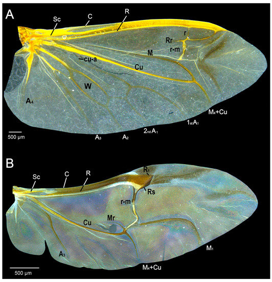 Hindwing venation nomenclature. (A)—Tenebrio molitor, (B)—Prostephanus truncatus. Wing vein abbreviations: (A) = anal, (Cu) = cubital, (C) = costal, (M) = medial, (R) = radial, (RS) = radial sector, (r-m) = radio-medial, (Sc) = subcostal, (W) = wedge-cell [57]. Numbers indicate vein branches.