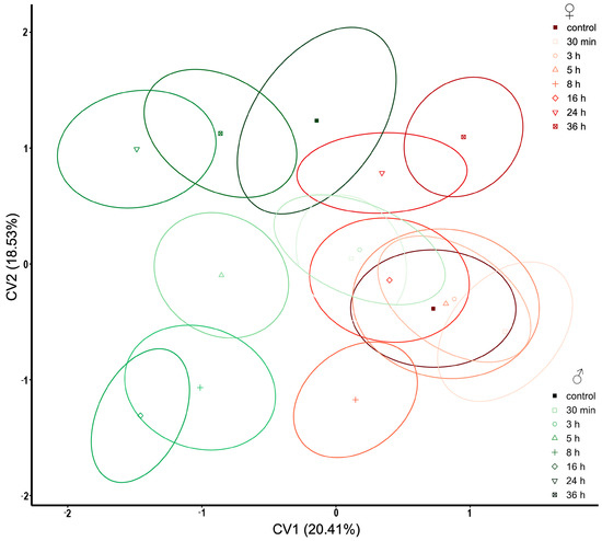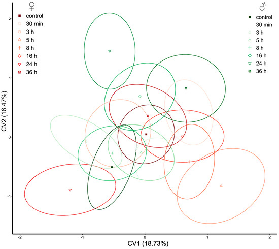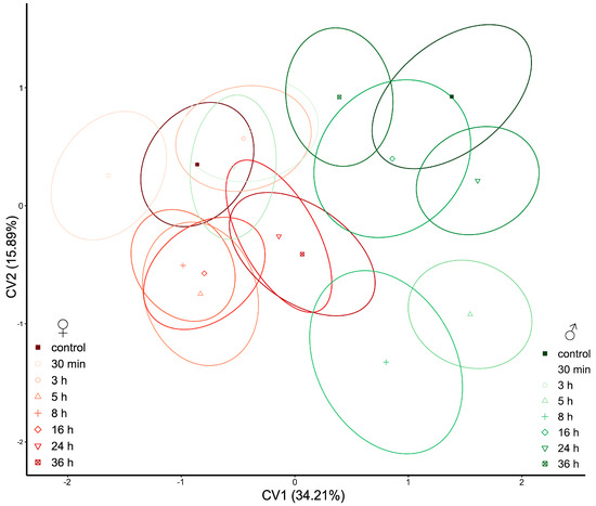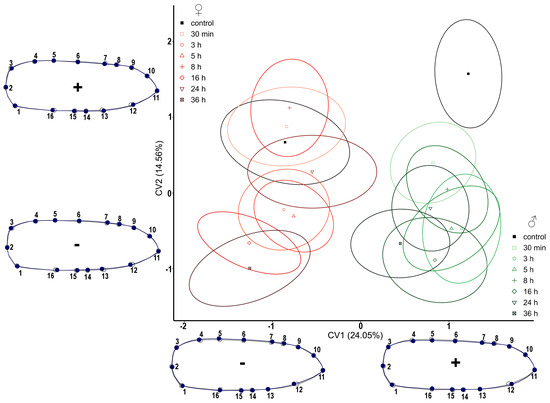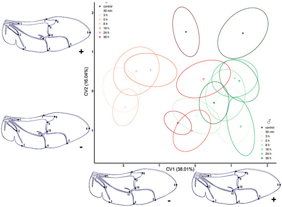 The hindwings of P. truncatus are susceptible to pirimiphos-methyl, since the treated groups are separated from the controls by the CV2 axis (Figure 6). Both male and female control groups are in the CV2 positive part, while there is a tendency of displacement of the treated groups toward the negative part of the CV2. This is especially exhibited in the longest time treatment with pirimiphos-methyl, where the 36 h groups are the furthest from the controls (Figure 6).