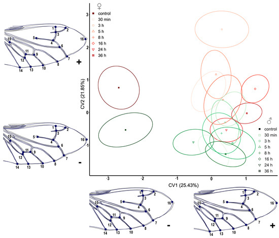 The CVA analysis of the hindwings of T. molitor revealed that the separation of the treatment groups in both males and females is much more obvious than in the analysis of elytra (Figure 4). All treatments are positioned in the CV1+ section, while the control groups of both sexes are placed on the opposite side (CV1-). Similarly, the biggest differences in wing shape are noticeable mainly in the distal part, represented by LM2, LM7, and LM16. Following the changes via CV2, these landmarks are joined by LM1 and LM5. Sexual dimorphism is also exhibited by the division of males and females along the CV2 axis. For both treatments and control groups, males are positioned in the negative and females in the positive part (Figure 4).