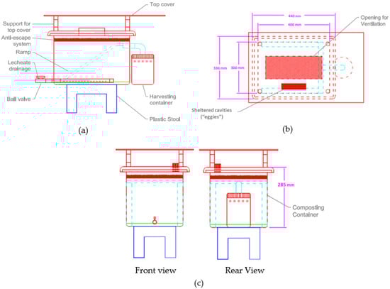 Design of the BSFL bin, (a) side view; (b) top view; and (c) front and rear view.