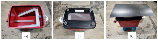 The fabricated BSFL bin, (a) inside bin; (b) lid without roof; and (c) lid with roof.