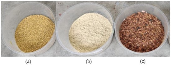 Condition of MCCM before mixing with food waste: (a) chicken feed; (b) rice bran; and (c) pulverized garden waste.
