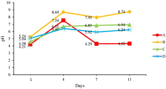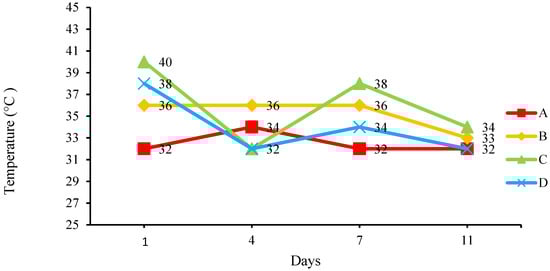The medium for each bin was sampled to measure pH, temperature, and moisture content. Figure 5 shows the change in the measured pH of the medium. The pH value for Day 1 is for the fresh food waste mixtures, while the values for Days 4 to 11 are the pH of the frass. As anticipated, the pH of the frass in BSFL bins B, C, and D seems to increase from acidic to approaching neutral from Day 4 onwards. An increase in pH values from 5 to 8 proved that the compost was undergoing a maturing phase [21,22]. The frass in BSFL bin A showed a decreasing pH and turned acidic on Days 7 and 11 because a large percentage of the larvae were reaching the instar 4 stage faster than the larvae in other BSFL bins and had stopped consuming the food waste. Figure 5 show the sudden increase in the weight and length of the larvae in BSFL bin A. To utilize frass as a fertilizer, the optimum range is 6–8 as the bacteria population is dominant at around neutral pH, enhancing the breakdown of organic matter and cycling of nutrients for plants. Meanwhile, the rate of mineralization of nutrients by soil microbes into forms that are available to plants is slower in acidic soil, thereby restricting plant uptake. As a result, it is not ideal to utilize acidic soil as a plant fertilizer [22].