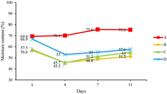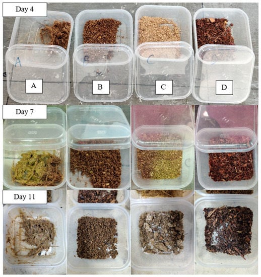 The change in the moisture content of the mediums from Day 1 to 11 is shown in Figure 7. The mediums with added MCCM seem to have a lower moisture content than the medium without MCCM (medium A). The difference was immediately apparent, where mixing pulverized food waste with MCCM resulted in mediums B, C, and D tending to have a slightly lower moisture content on Day 1. On Day 4, the mediums with added MCCM showed a decreased moisture content, while the moisture content of medium A increased. All mediums tend to show a similar moisture content trend on the final day of the experiment, and the moisture content of all mediums was within the optimum range. The mediums with added MCCM maintained a moisture content of 51.2 to 57.6%, while medium A without MCCM had a moisture content of over 70%. The high moisture content of medium A caused the frass to be moist, sticky, and foul-smelling. Dortmans [24] observed that a moisture content exceeding 60% caused nutrient leachate and foul odor, similar to BSFL bin A, while a moisture content of less than 40% hindered the growth of larvae and bacteria [25]. The moisture content data showed that food waste mixed with MCCMs produced lower moisture content of frass at final day compared to food waste without MCCMs. Although the growth rate of BSFL increased with higher moisture contents (BSFL can survive in medium with a moisture content as high as 80%), the high moisture contents caused problems in maintenance and waste separation work [26]. These findings indicate a trade-off between BSFL growth, ease of maintenance, and leachate prevention.