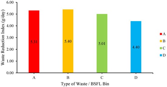 The ambient temperature and humidity of the experiment site were recorded for 5 days before starting the experiment. The ambient temperature ranged between 30.6 and 32.4 °C and was close to the optimum temperature of 30 °C [19]. Meanwhile, the ambient humidity was over 65%. It was concluded that the surroundings of UKM were close to optimum condition and suitable for BSF rearing. In addition, we tabulated and then plotted the graphs for the mediums’ pH, temperature, and moisture content and compared the different food wastes and MCCM compositions. The efficiency of the MCCM in reducing waste was determined by calculating the waste reduction index (WRI) for each BSFL bin on the final day of the experiment. A higher WRI value indicates better waste reduction efficiency [20].