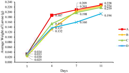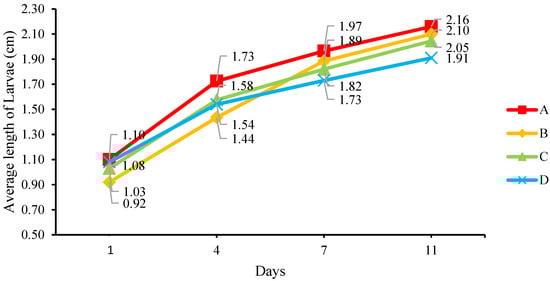 Figure 9 and Figure 10 show the average weight and length of the larvae, while Table 2 shows the larval growth rate in terms of weight and length. The larvae reared on all mediums tend to have a similar weight and length pattern, where their growth surged on Day 4 and decreased from Day 7 to Day 11. The larvae reared on medium A reached the peak growth rate quicker than those on other mediums, and a large percentage of the larvae reached the instar 4 stage on Day 4, after which they grew at a slower rate. On Days 7 and 11, the growth rate of the larvae reared on mediums B and C exceeded those on medium A, but they were slightly smaller. The highest growth rate in weight (72.36%) and length (11.66%) was recorded in the larvae reared on medium B on the final day of the experiment. However, the average weight and length of the larvae reared on medium B were lower than those on medium A, where the final weight and length of the larvae on medium B were 0.224 g and 2.10 cm, and those on medium A weighed 0.228 g and were 2.16 cm long. The larval sizes in this experiment were similar to those recorded by other researchers [26,28], where the highest weight was 0.200–0.225 g. The larvae reared on medium A had the best average weight and length, followed by the larvae on medium B; there is a possibility that the size of the larvae reared on medium B would exceed those reared on medium A if the duration of the experiment was longer. Despite this, medium A produced a higher moisture content of frass compared to medium B, based on Figure 9, which seems to show that MCCM is necessary in controlling moisture content and enhancing the quality of frass. A comparison of the medium with added MCCM showed that medium B containing chicken feed had the best overall result, indicating that chicken feed is the best MCCM for obtaining the heaviest and longest larvae. It has been proven by previous studies that the higher protein content of larval feeding medium produced better larval growth [22,29].