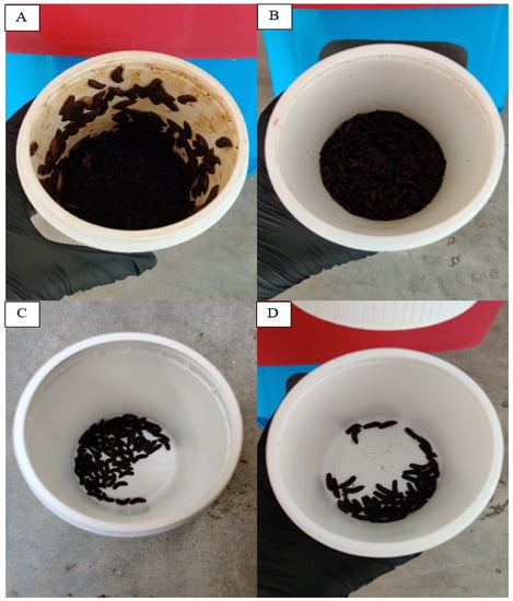 Table 3 shows the average weight and length of the prepupae from the harvesting container. The average weight and length of the prepupae are similar to those of the larvae on Day 11. The prepupae from BSFL bin A tend to have the highest weight (0.225 g) and length (2.15 cm), followed by the larvae from BSFL bin B (0.221 g and 2.11 cm). As anticipated, the larvae from BSFL bin D seem to have the lowest weight and length of 0.195 g and 1.89 cm. Previous studies have shown that larvae reared on vegetables had the lowest growth rate because vegetables have a high fiber content and are difficult to digest [30,31]. The average weight of the prepupae in this experiment was lower than the average weight of the larvae on Day 11, which is similar to the result obtained by Cheng et al. [26] and Kim et al. [32], because the prepupae ceased feeding and began to eliminate the remaining food from their digestive systems in preparation to pupate. In this stage, the prepupae use the reserve fats in their body to generate energy since movements and metamorphosis require energy, as reported by Mirwandhono et al. [33].