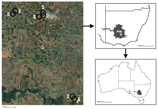Location of the seed carrot study sites (1–7) where the habitat pools were deployed within the Riverina region of New South Wales, Australia.