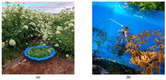Experimental design of the habitat pools deployed to attract eristaline flies: (a) a habitat pool yet to be filled with water within a seed carrot field; (b) an adult, female Eristalis tenax (Linnaeus, 1758) fly within a deployed habitat pool. Arrowheads are pointing to the habitat pool and adult eristaline fly for clarity.