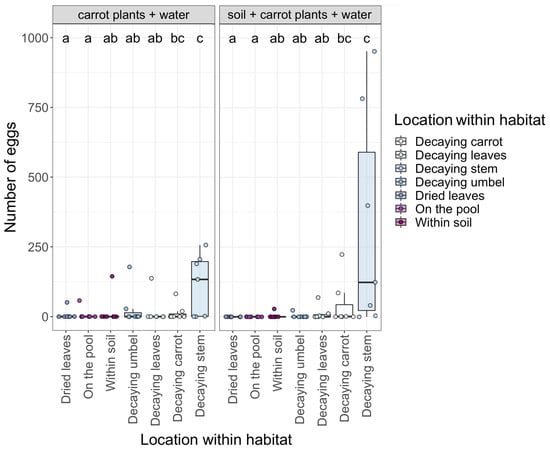 The number of eggs oviposited by female eristaline syrphid flies within the deployed pools based on habitat (carrot plants + water only and the soil + carrot plants + water) and the location where the eggs were laid. Letters indicate significant differences between locations (p < 0.05). Individual data points representing each habitat pool (n = 14 in total) are jittered onto the figure for clarity. Lower to upper box boundaries indicate the inter-quartile range (IQR). Whiskers are extended to the furthest data point within 1.5x the IQR from each box end.