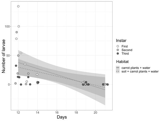 The number of larvae (first, second and third instar) found within the pools based on habitat (soil, carrot plants, and water or carrot plants and water only) and the number of days the habitat pools were left to decay. Individual data points representing larval instars found per pool (n = 14 per instar; 42 in total) are jittered onto the figure for clarity. The shaded outline of the linear regression lines indicates standard error.