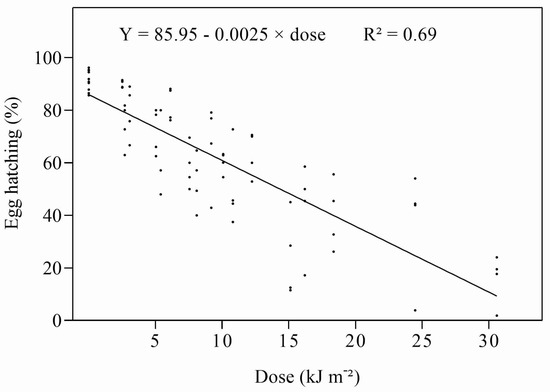 Relationship between daily UV-B dose and percentage of egg hatch.