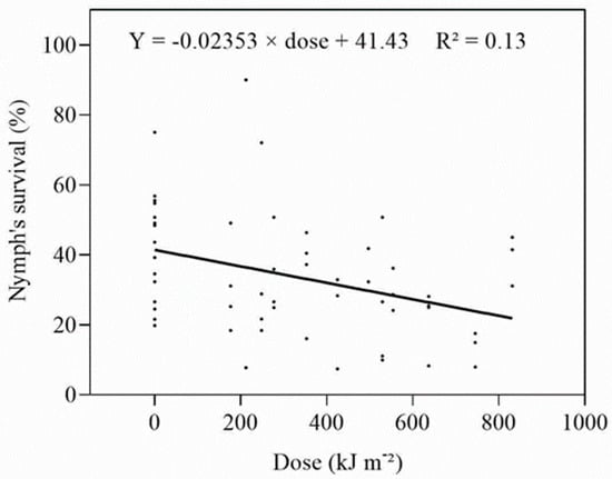 The survival of early instar nymphs of D. citri was little affected by UV-A (Figure S5) and, when survival was plotted against the dose, a weak, linear, negative relationship was obtained (Figure 3). Adults were only obtained in Expt 5, and only from the 77 W m−2 (277.2–831.6 kJ m−2 d−1) group. The ED50 estimated from the combined data was 324.63 kJ m−2 d−1. The proportion of adults emerging from the treated and untreated nymphs was low; however, there was a significant (F = 6.337, p = 0.003) increase in the number of days adults took to develop when nymphs were treated at greater than 550 kJ m−2 each day.