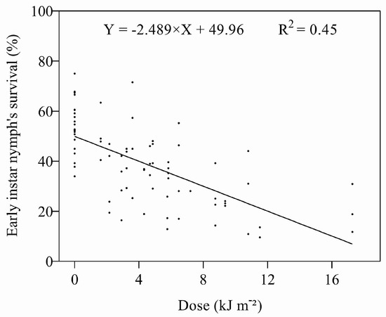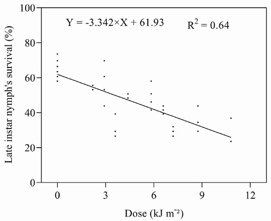 The mortality of late instar nymphs exposed to UV-B radiation increased with an increasing dose of UV-B (Figure 5). The effects of UV-B irradiation on late instar nymphs were less than that experienced for early instars; the ED50 for the late instars was estimated to be 6.17 kJ m−2 d−1.