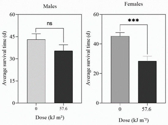 Effect of UV-B on the longevity of adult male and female D. citri treated for 16 h d−1 at 1 W m−2 until they all died. The data are means (n = 30) and the bars represent the standard errors. ns = not significant. *** = significant at p = 0.01.