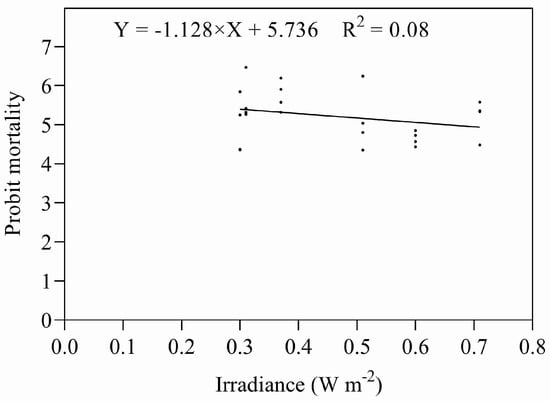 We also observed that the Bunsen–Roscoe reciprocity law applies to D. citri eggs and early instar nymphs treated with UV-B. Egg hatching and survival of early instar nymphs were negatively correlated with cumulative UV-B exposure, independent of UV-B intensity. The validity of the Bunsen–Roscoe law on the biology of insects has not been investigated. However, two studies have explored the relationships between dose and irradiance using Tetranychus urticae subjected to various treatments with UV-B. Both studies [46,66] found that the hatchability of eggs; the mortality of eggs, larvae, teleiochrysalises, and adult females; and the development time from larvae to adult emergence were all linearly related to dose, regardless of intensity. Hence, under the range of doses and irradiance times used, all three studies have shown the reciprocity law was upheld. The applicability of the law needs to be examined in a greater range of species because it does not apply to the development and survival of amphibians [67] and aquatic invertebrates [68].
