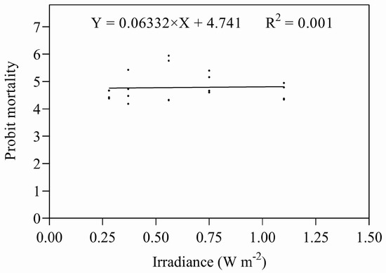 Eggs and early instar nymphs were exposed to five different combinations of irradiances and durations of UV-B, giving doses designed to approximate their relevant ED50s. Both sets of data were subjected to ANOVA; there were no significant differences between the treatments in either data set (eggs: F = 1.773, P = 0.187; nymphs: F = 0.893, P = 0.492). Both data sets were also subjected to regression analysis (Figure 7 and Figure 8), regressing irradiance against probit mortality; the resulting coefficients of determination were low for both stadia (eggs: R2 = 0.203, p = 0.186; nymphs R2 = 0.051, p = 0.876).