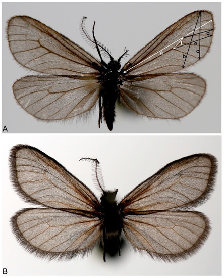 Description. (Heterogynis serbica Stojanović, sp. nov.): ♂ (Figure 3A). Forewings: 9.1–9.6 mm (HT 9.2 mm), wingspan 17.4–19.1 mm (HT 17.4 mm), body length 6.1–6.7 mm (HT 6.7 mm).