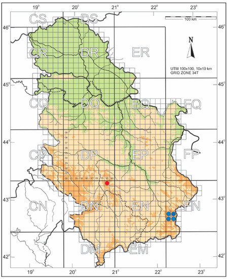 - Lakušić, D. (Ed.) Staništa Srbije, Rezultati Projekta, “Harmonizacija Nacionalne Nomenklature u Klasifikaciji Staništa sa Standardima Međunarodne Zajednice”; Institute of Botany and Botanical Garden Jevremovac, Faculty of Biology, University of Belgrade, the Ministry of Science and Environment the Republic of Serbia: Belgrade, Serbia, 2005. [Google Scholar]