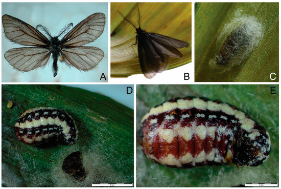 Paratype. Serbia, Srebrenac, 5 mm, about 80 km west of the city of Niš and about 30 km south of the city of Kraljevo, Mt. Kopaonik, 1600 m, 18 June 2010, 17 July 2010, D. V. Stojanović (ILFE); 2 ff with cocoons, Mt. Kopaonik, Srebrenac 1600 m, 6 July 2020, D. V. Stojanović (ILFE); 2 ff Mt. Kopaonik, Srebrenac, on Veratrum album L. 1600 m, 28 June 2022, D. V. Stojanović (ILFE). The cocoon is silvery–white and scarce hairy (Figure 3C).