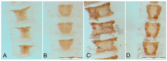 Abdominal plates of (A,B) Heterogynis serbica sp. nov. (C,D) Heterogynis zikici, sclerotization of tergites and sternites III–V. Bars denote 1 mm.