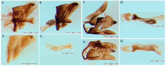 The male genital apparatus of H. serbica sp. nov. is significantly different in comparison to the male genitalia of H. zikici (Figure 8). The length of the aedeagus is different in the two species. The length of the aedeagus in H. serbica sp. nov. has a range of 1123–1221 μm (Figure 8A,F,H), while the length of the aedeagus in H. zikici has a range of 1074–1270 μm (Figure 8B,D). The width of the cucullus in H. serbica sp. nov. measured in the widest region is 216.67–296.58 μm (Figure 8A,E,G), which is significantly larger than the same structure in H. zikici at 197.00–221.79 μm (Figure 8B,C). The vesica in H. zikici is filled with small, clustered, dark spikes (Figure 8B,D), while the vesica in H. serbica sp. nov. contains numerous, small, scattered, pale spikes—cornuti (sclerotized plate) (Figure 8A,F,H).