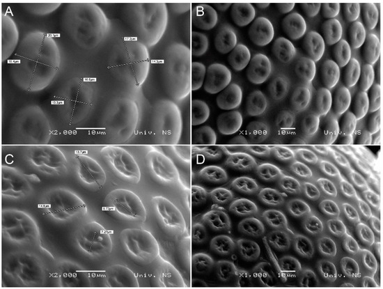 The ocelli of the compound eye in H. serbica sp. nov. are prominently convex, with a diameter of 13.3–20.1 μm (Figure 9A,B). In H. zikici, the ocelli have a central depression and a diameter of 13.7–14.8 μm (Figure 9C,D).