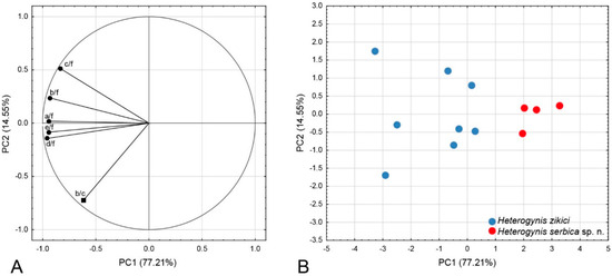 The ANOVA revealed a significant difference between H. zikici and H. serbica sp. nov. in five out of the six analysed forewing distance ratios (a/f: F1, 10 = 14.112, p = 0.0037; b/c: F1, 10 = 4.83, p = 0.0527; b/f: F1, 10 = 21.686, p = 0.0009; c/f: F1, 10 = 11.5747, p = 0.0068; d/f: F1, 10 = 13.195, p = 0.0046; e/f: F1, 10 = 11.027, p = 0.0077). Moreover, the PCA conducted on the overall data set produced six PCs, from which the first two describe the majority of forewing variation (91.75%) (Table 2). Five ratios singled out as important for species delimitation with the ANOVA, a/f, b/f, c/f, d/f and e/f, were negatively correlated with PC1 (Figure 15A). This PC axis with the majority of the forewing variation (77.21%) clearly separated H. zikici and H. serbica sp. nov (Figure 15B). The PC2 axis was negatively correlated with the b/c ratio and depicts the population variability in H. zikici with 14.55% of forewing variation (Figure 15).