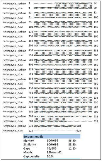 The readable nucleotide sequence of the H. serbica sp. nov. COI barcode showed a fragment size of at least 668 bp. The nucleotide base composition (A = 204, T = 271; G = 79, C = 114) of the H. serbica sp. nov. mtDNA COI region showed, as in most other mitochondrial insect genes, poor G/C nucleotides (28%) while being rich in A/T nucleotides (71%). The alignment of the two sequences (H. serbica sp. nov. and H. zikici) showed 88.3% identities (606 bp of 686 bp; Figure 16). Moreover, the sequence alignment after removing the unaligned sites from the two ends showed 99.5 % identity (606/609, BLASTn, Supplementary Figure S2), revealing that three alterations in the partial nucleotide sequence of the COI gene were found. In addition, three point mutations, particularly transitions, were observed in, 87th base position downstream of the start codon of the H. serbica sp. nov. sequence (mutation C→T), 286th base position from the start codon (mutation A→G) and 446th base position in the sequence from the start codon (T→C).