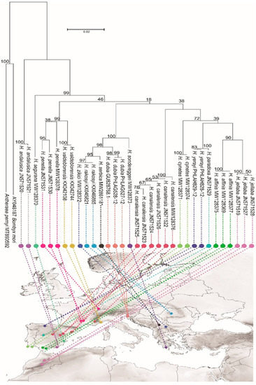 - Mutanen, M.; Kivelä, S.M.; Vos, R.A.; Doorenweerd, C.; Ratnasingham, S.; Hausmann, A.; Huemer, P.; Dincă, V.; Van Nieukerken, E.J.; Lopez-Vaamonde, C. Species-level para- and polyphyly in DNA barcode gene trees: Strong operational bias in European Lepidoptera. Syst. Biol. 2016, 65, 1024–1040. [Google Scholar] [CrossRef] [PubMed]