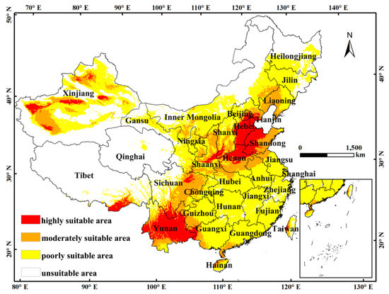 The Maxent model provides two metrics to determine the importance of the output climate variable in the final model, namely, the percentage of contribution and ranking importance. Each step of the Maxent algorithm increases the gain of the model by modifying the individual variable covariates, and the program can then allocate the increase to the climate variables on which the variables depend. The percentage contribution was obtained at the end of the training process by means of transforming the increase into a percentage. The permutation importance of each variable was determined by randomly arranging the value of that variable between training points and measuring the reduction in the training results of the receiver operating characteristic curve (ROC). A large reduction indicates that the model relies heavily on the given variable [21]. Based on the model-generated fitness index, the suitable distribution area of F. occidentalis was divided into four levels, namely, the unsuitable area, moderately suitable area, poorly suitable area and highly suitable area. A 10-fold repeat cross-validation was then performed to run the Maxent software in order to prevent random errors resulting from the predicted sample. Finally, the reclassification function in ArcGIS software was used to obtain the distribution level of F. occidentalis in the national suitable area, as shown in Figure 1.