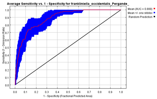 To date, there have been many studies on the invasive pest F. occidentalis, but none of them have involved the prediction of its potential distribution area [4,24]. In this work, the geographical distribution of the species was determined based on the MaxEnt model and linked to 19 bioclimatic variables to analyze the relevance of each variable. Several variables with decisive effects were identified to predict the future distribution of the species. This is empirical, data-driven research, and its aim is to provide an important reference and theoretical basis for the development of reasonable prevention and control measures.
