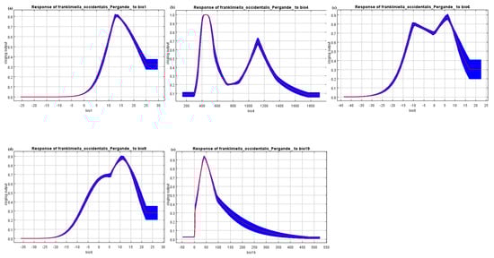 The responses of the species to changes in the selected variables are shown in Figure 3, and each curve represents a different model, i.e., a Maxent model created using only the corresponding variable. These plots reflect the dependence of the prediction suitability on the selected variable and the dependence caused by the correlation between the selected variable and other variables. According to the response curve, when the annual mean temperature (Bio 1) is between 12.0 °C and 13.0 °C, this is most suitable for the survival of F. occidentali, and the curve shows a straight downward trend between 13.0 °C and 24.0 °C and remains stable after 24.0 °C. It is noteworthy that the min temperature of the coldest month (Bio 6) has two peaks of 0.80 and 0.88 at −11.0 °C and 5.4 °C, respectively, as can be seen from Figure 3b. In between, at −1.78 °C, there is a small, low peak with a value of 0.69. It can be seen from Figure 3c that when the mean temperature of the driest quarter (Bio 9) is not between 1.9 °C and 5.2 °C, there is a stagnation stage, and then the temperature gradually increases by 9.8 °C to reach a peak. Overall, increased temperatures lead to a greater distribution. In addition, the trend of the precipitation of the coldest quarter (Bio 19) variable has a rapid rise and a rapid decline, peaking at 18.3 mm of precipitation and turning from a rapid decline to flat decline when the precipitation is 76.17 mm. It can be seen that temperature and precipitation are the main factors affecting the distribution of F. occidentalis.