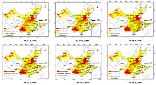 In this study, the potential distribution of F. occidentalis in the context of two future periods (2050s and 2090s) and three RCPs (RCP2.6, RCP4.5 and RCP8.5) was plotted, and the potential distribution level is shown in Figure 4. Table 3 shows that future climate change will have a certain impact on the potential distribution area of F. occidentalis, and the level of ecologically suitable zones will change greatly. In the 2050s RCP2.6, RCP4.5 and RCP8.5 scenarios, the area of the high-suitability zone for F. occidentalis is 66.15 × 104 km2, 60.72 × 104 km2 and 68.65 × 104 km2, respectively; in the 2090s RCP2.6, RCP4.5 and RCP8.5 scenarios, the area of the high-suitability zone for F. occidentalis is 67.32 × 104 km2 and 66.37 × 104 km2, respectively. In the RCP4.5 and RCP8.5 scenarios, the area of the F. occidentalis high-suitability zone is 67.32 × 104 km2, 66.37 × 104 km2 and 59.40 × 104 km2, respectively. It can be seen that in the different RCP scenarios, the area of the high-suitability area shows an overall decreasing trend. In the RCP8.5 scenario in the 2050s, the area of the medium-suitable area is increased the most, with an increase of 23.4% compared with the current scenario. It is expected that in the RCP2.6, RCP4.5 and RCP8.5 scenarios in the 2090s, the total suitable area will decrease by 6.3%, 18.4% and 6.6%, respectively. In general, the area of the high- and low-suitable areas will continue to decrease in the future, and the area of the medium-suitable areas will significantly increase.